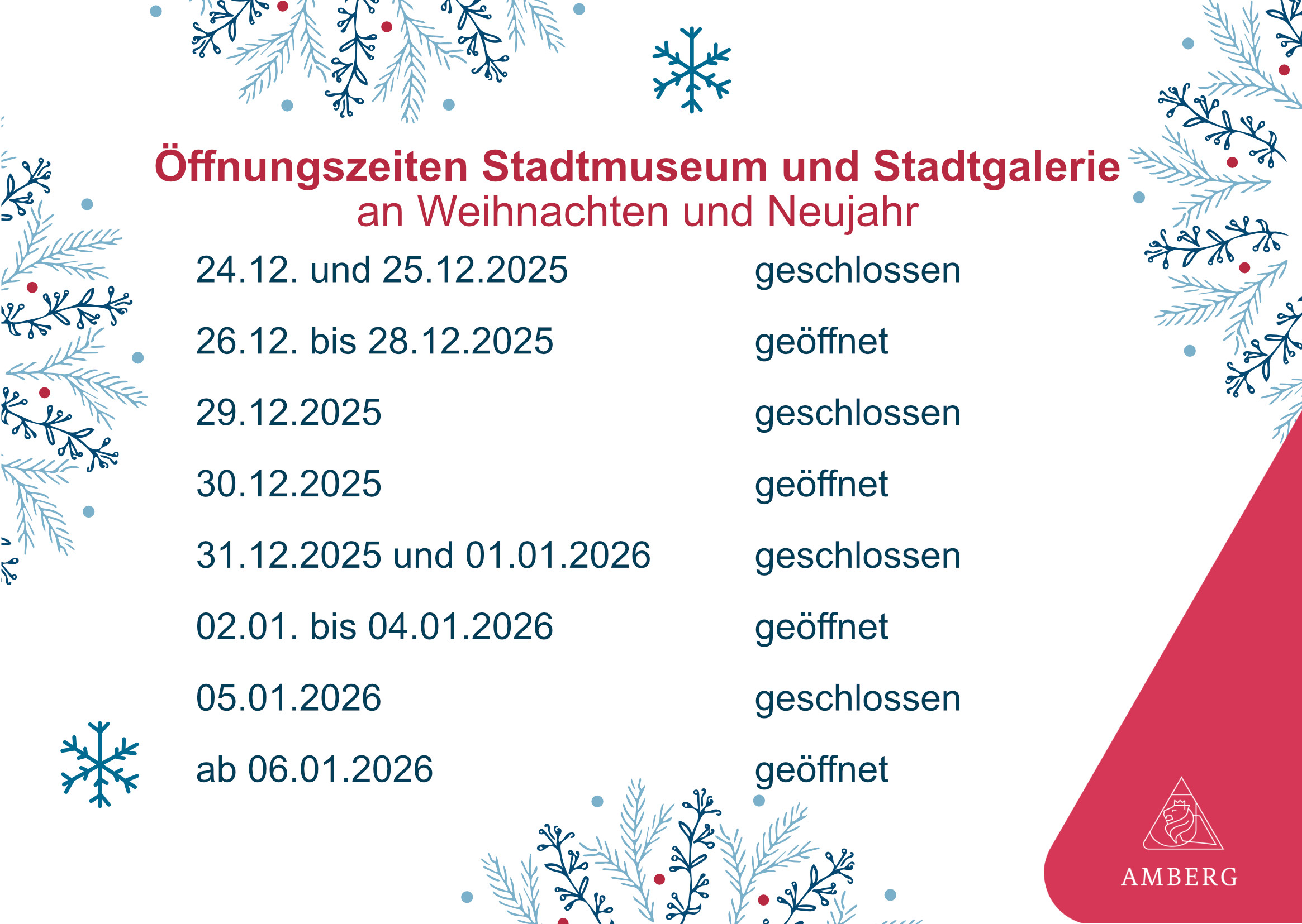 Das Stadtmuseum Amberg und die Stadtgalerie ALTE FEUERWACHE haben über Weihnachten und Neujahr folgende Öffnungszeiten: