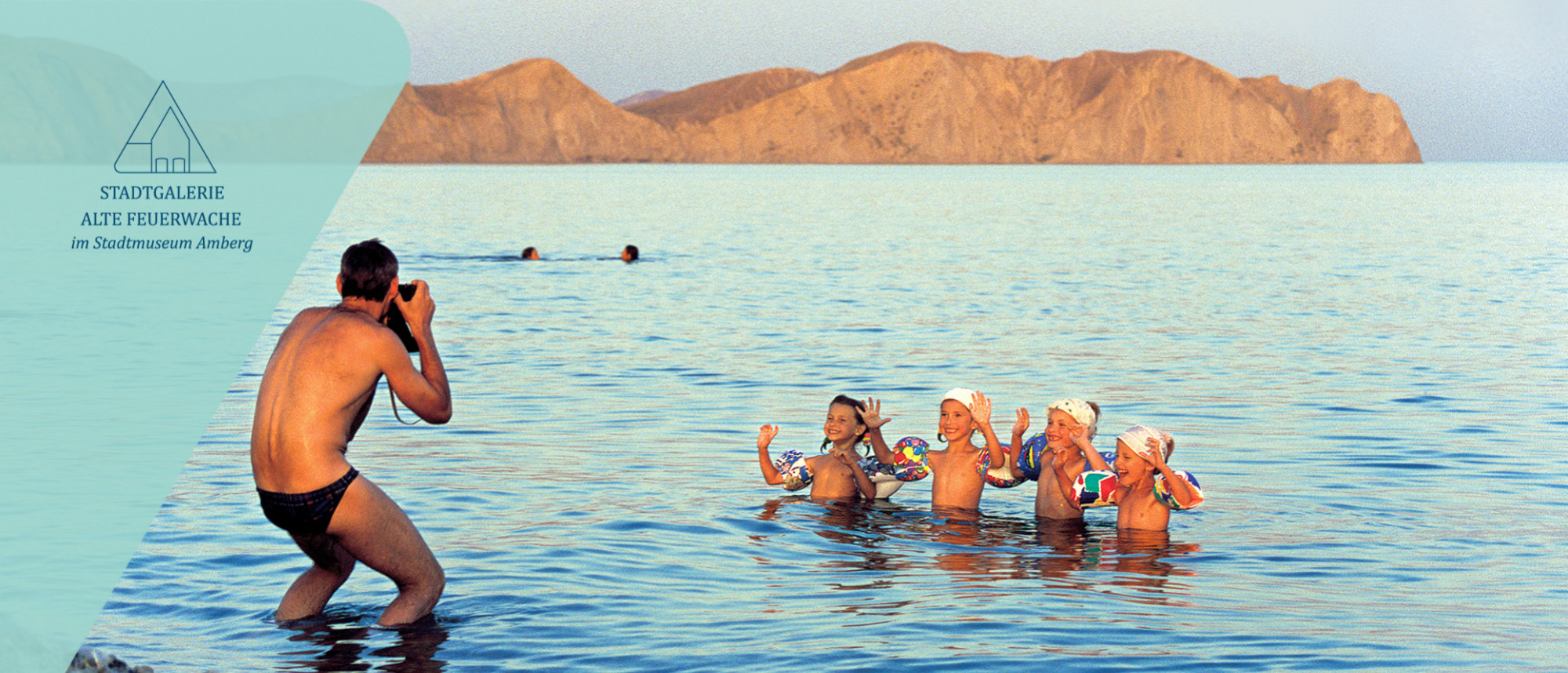 Foto eines im Wasser stehenden Mannes in Badehose, der vier kleine, winkende Kinder im Wasser vor sich fotografiert."Im schwarzen Meer", 2003, Fotografie Digitaldruck auf Alucobond, 110 x 70 cm