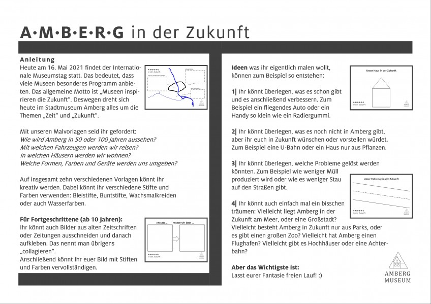 Neue Perspektiven auf das Museum und seine Sammlung liefert der Themenrundgang „Zeit und Zukunft im Stadtmuseum“. Verschiedene Stationen schaffen Impulse zu diesem weitläufigen Themenfeld und werden neu verknüpft. Der knapp zehnminütige Rundgang ist auf dem YouTube-Kanal des Stadtmuseums verfügbar. Kreatives Gestalten für Kinder ab 6 Jahren ermöglichen die Malvorlagen „Amberg in der Zukunft“, die über den hauseigenen Facebook-Kanal abgerufen werden können. So gilt es beispielsweise künftige Büros, Wohnhäuser und Fahrzeuge zu erschaffen.