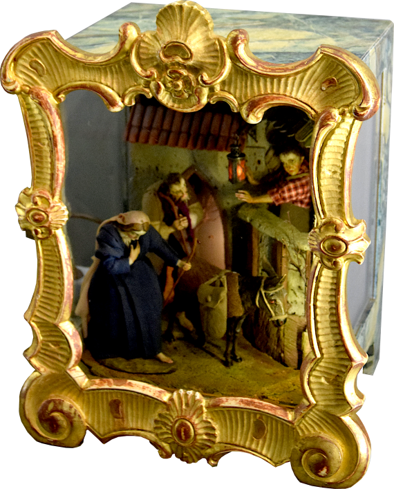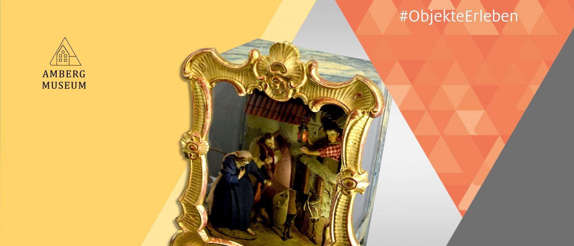 Ein besonderer, bereits seit über 80 Jahren bestehender und gepflegter Brauch bei den Amberger Krippenfreunden ist das "Herbergstragen" in der Adventszeit. Einblicke dazu gewährt u. a. Reinhard Heldmann, 1. Vorstand der Amberger Krippenfreunde e. V., im Video. Da das Herbergstragen in diesem Jahr leider nicht in der üblichen Form stattfinden kann, ist das Herbergskästchen ebenfalls in der Ausstellung "95+1 Jahre" gezeigt. Es kann von drei Seiten eingesehen werden, wobei die Hauptansicht mit einem golden gefassten Rahmen fein verziert ist. Gezeigt ist der Moment bei der Herbergssuche, als der Wirt Maria und Josef die Unterkunft verweigert. Die 15 cm großen Figuren sind aus Holz (Speckbacher) gefertigt und wurden von der Ehefrau des damaligen Vereinsvorstands bekleidet. Besonders bemerkenswert ist die Feinheit der Gesichter und Zartheit der Gliedmaßen. Trotz zurückgenommener Gestik besitzen die Figuren einen intensiven Ausdruck. Die Strapazen der langen Reise sind Maria und Josef deutlich anzusehen und berühren dadurch umso mehr. Doch auch der Esel als treuer Gefährte auf der Reise ist zu beachten. Er hat für den kurzen Moment des Halts einen seiner Hinterhufe auf der Spitze abgestellt und eine entlastende Haltung eingenommen. Zugleich hat er aufmerksam ein Ohr nach hinten in Richtung des Gesprächs zwischen Josef und dem Wirt, und das andere nach vorne gerichtet. Durch die erhöhte Standposition des Wirts wird eine gewisse Dominanz gegenüber den Herbergssuchenden deutlich, zudem ist eine weitere Distanzierung durch die Brüstung gegeben. Die Architektur ist mit wenigen Elementen angedeutet. So sind eine Mauer mit spitzbogigem Durchgang und Bäumen dahinter sowie Teile von Dächern erkennbar.