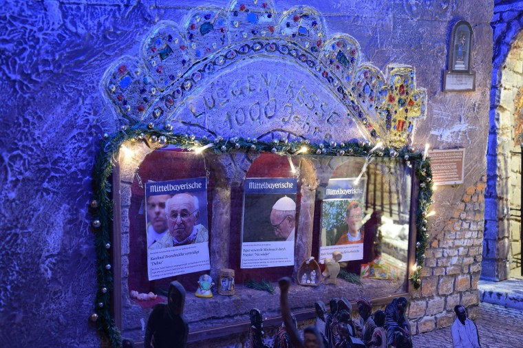 Warum? Weil die Krippe die Geburt des Heilands in der Gegenwart unserer Heimat darstellt. Die Szene zeigt die im Krieg zerstörte Eingangshalle der Obermünsterkirche in Regensburg. Sie ist bevölkert von afrikanischen Flüchtlingen, die 2015 über Spanien nach Europa kamen. Nicht nur die ehedem Freie Reichsstadt Regensburg, sondern Deutschland als Ganzes ist gegründet auf dem Heiligen Römischen Reich Deutscher Nation, für das die historische Bügelkrone und ihre Juwelen stehen. Sprich, wir in unserer Zeit sind immer Kinder unserer Geschichte und Kultur. Das gilt für Kirche, Politik und Gesellschaft. Mit allen Errungenschaften. Aber auch mit allen Problemen, wie Populismus und Kirchenkrise. Hirten gibt es in der Oberpfalz dieser Krippe nicht. Die „Underdogs“ unserer Zeit sind in dieser Krippe die Flüchtlinge."