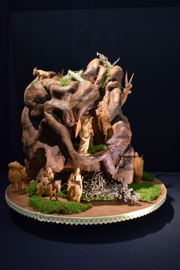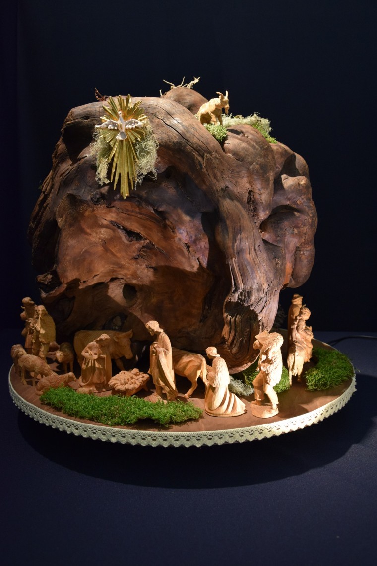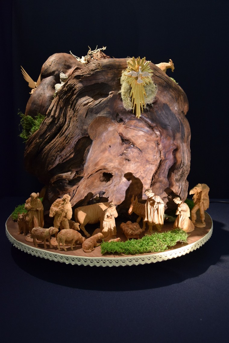 Die Figuren (natur) der Wurzelkugelkrippe stammen von Rudi Lindner aus Südtirol und sind aus Zirbelholz. Als Einzelszenen sind die Verkündigung an Maria, dieVerkündigung an die Hirten, die Herbergssuche, die Anbetung der Hirten sowie die Flucht nach Ägypten gezeigt. Die Krippe ist auf einem drehbaren Teller fixiert, sodass alle Szenen angesehen werden können. Für die weitere Gestaltung wurden Moose und Flechten genutzt.
