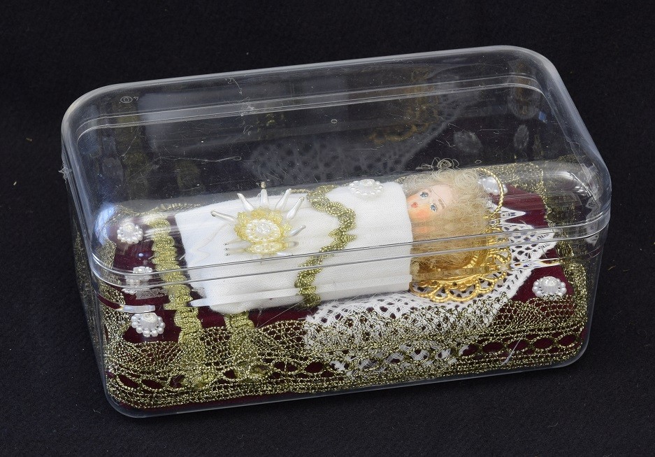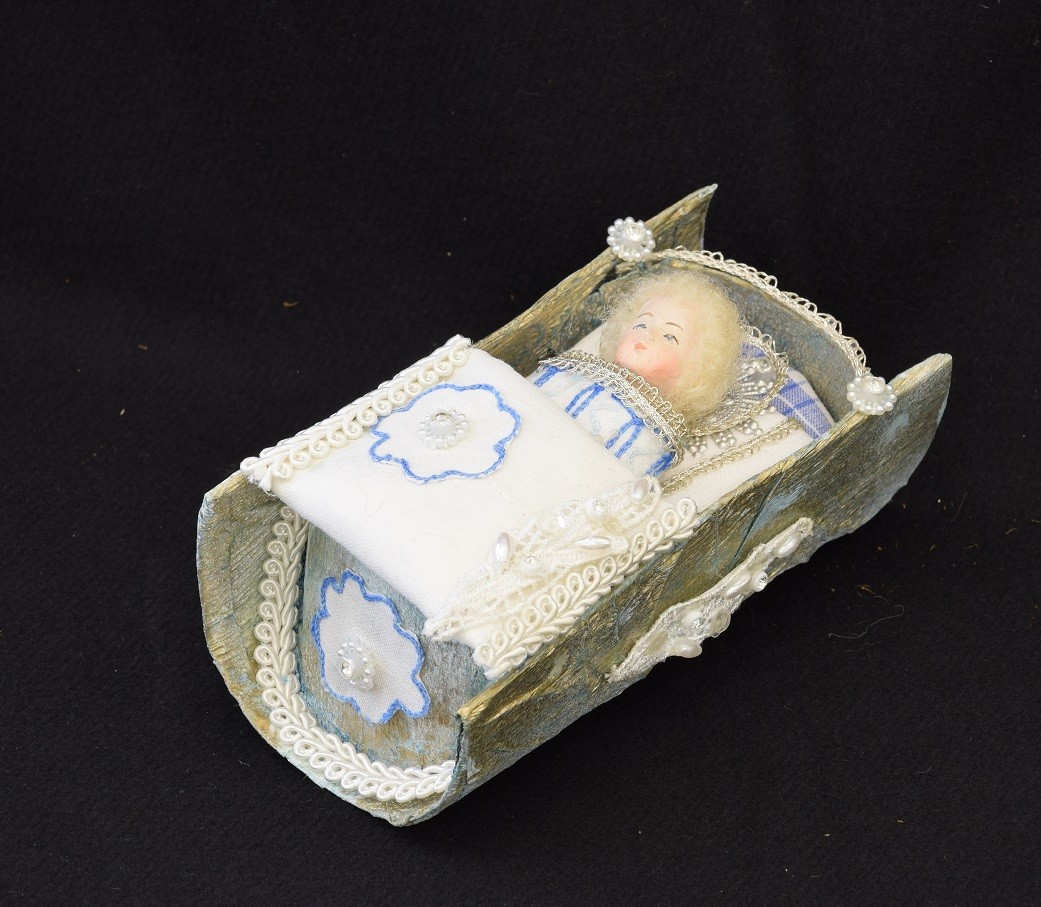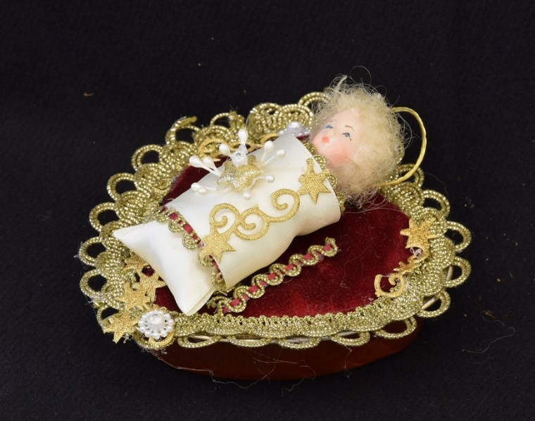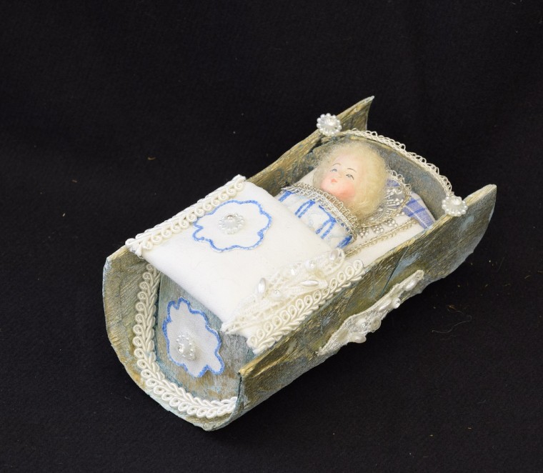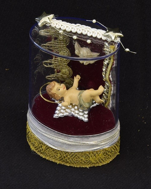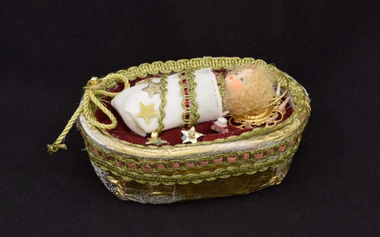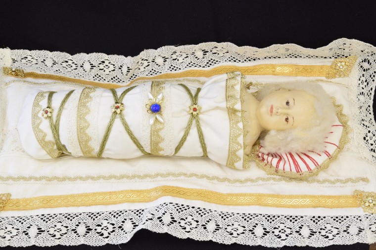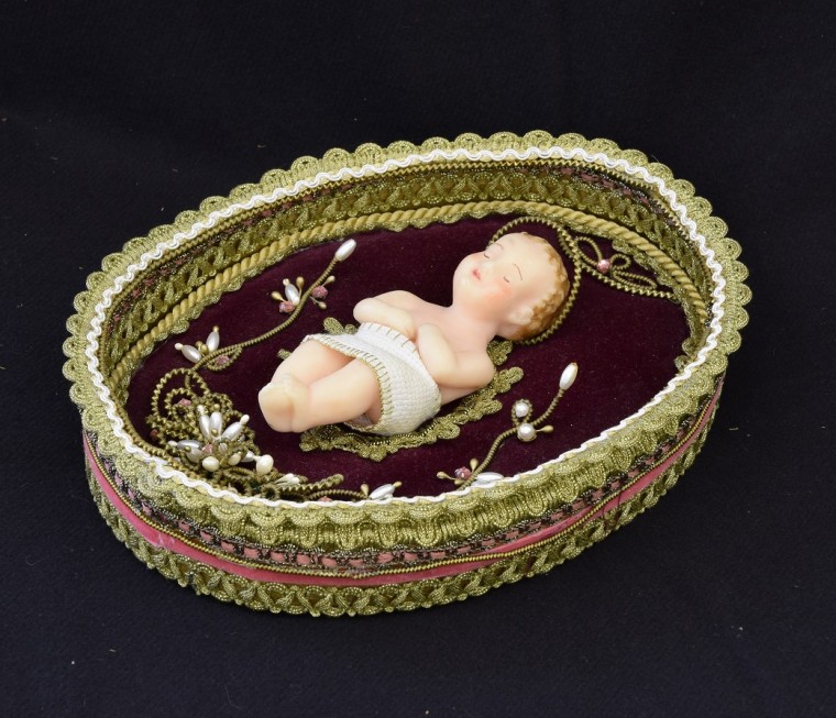 Neben den rund 50 ausgestellten Klein- und Großkrippen in der Ausstellung "95+1 Jahre", gibt es auch mehrere Fatschenkindl in unterschiedlicher Größe und Ausformung zu sehen. Bei dem Fatschenkindl, auch Fatschenkind oder Faschenkind genannt, handelt es sich um ein Andachtsbild. Es zeigt ein in Bändern gewickeltes - "gefatschtes" - Kindlein. Der Name leitet sich vom österreichischen "Fatsche" für "Binde" ab. Meist besteht das Fatschenkindl aus einem in Wachs geformten Köpflein und einem mit straff anliegenden Bändern umwickelten Steckkissen, das den Körper bildet.