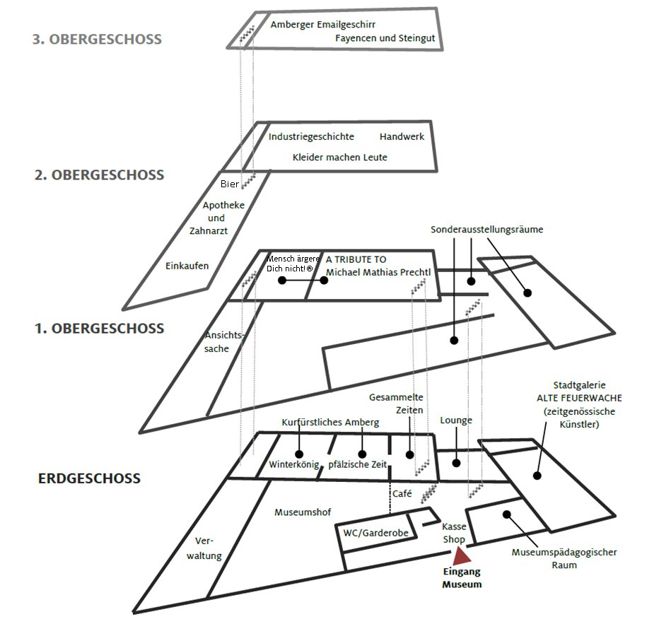 Dauerausstellung "Das kurfürstliche Amberg", Dauerausstellung "A Tribute to Michael Mathias Prechtl", Dauerausstellung "Mensch ärgere Dich nicht®" sowie der Sonderausstellungsbereich des Stadtmuseums und die Stadtgalerie ALTE FEUERWACHE.