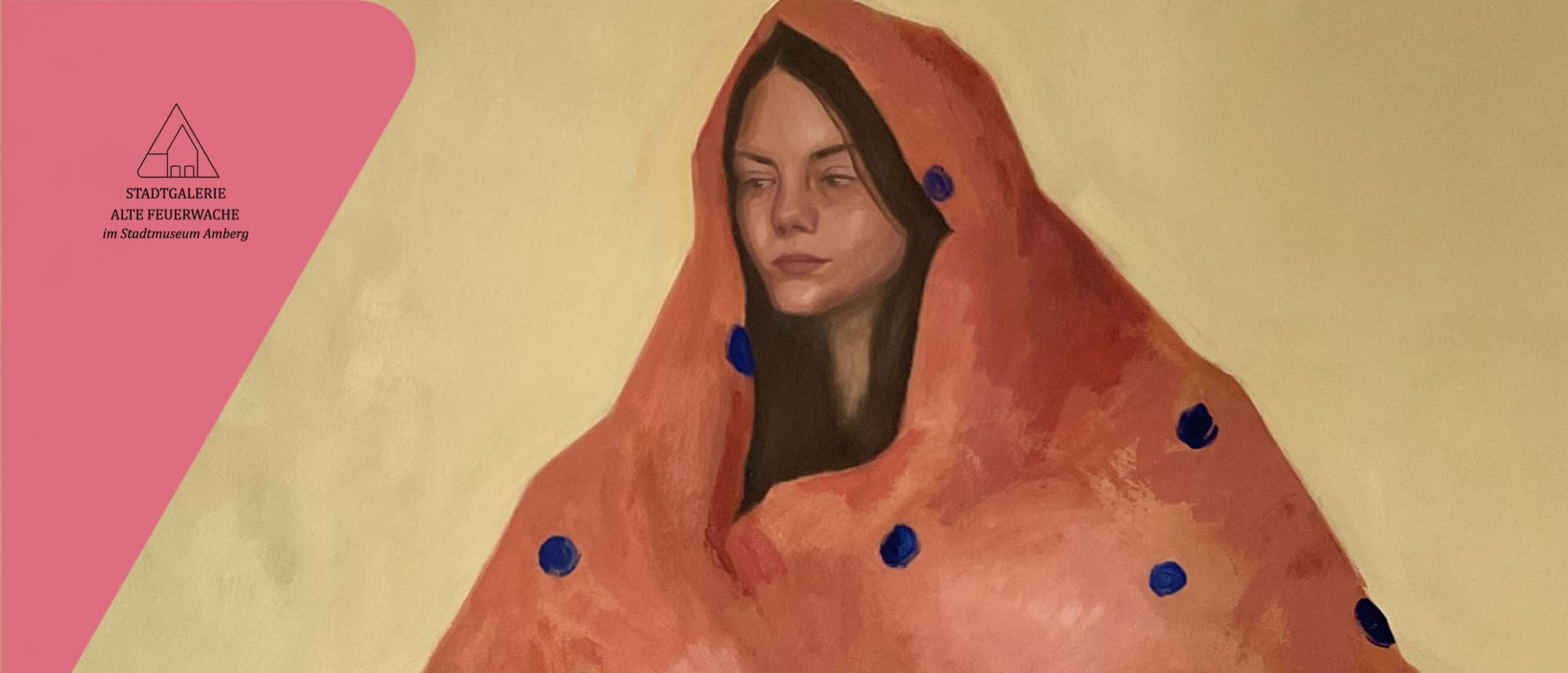 Frontales Brustbild der Künstlerin mit schräg nach links geneigtem Kopf, ernstem Blick und in eine große dunkle Jacke gekleidet. Im Hintergrund Porträtgemälde der Künstlerin.Porträt von Jule Rudrof