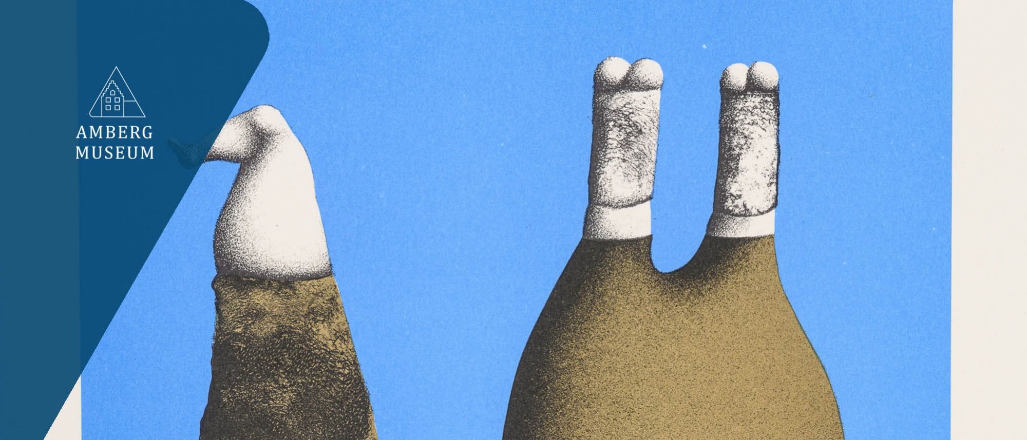 Detailausschnitt von einer Druckgrafik mit rundlichen Objekten in Ocker und weiß vor blauem Hintergrund.„Erwin und Maud“, Bildinnenmaß: 170 x 220 mm, Papiermaß: 246 x 258 mm, Steinlitho, 1974, Probedruck.