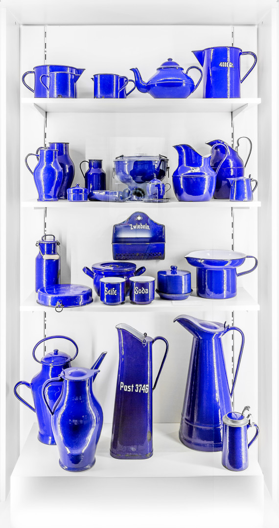 Vitrine mit Emailgeschirr im typischen "Baumann-Blau"